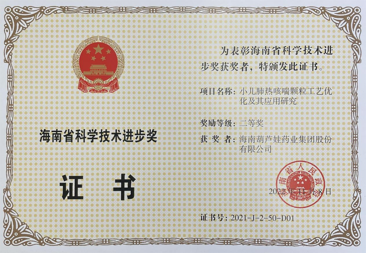 为此,小儿肺热咳喘颗粒的制备方法获得了第二十一届中国专利优秀奖(2019年),专利申请号:ZL201010134951,此次作为专利技术的应用,获得了2021年度海南省科学技术进步奖二等奖。在此之前,利来w66牌小儿肺热咳喘颗粒还多次被授予“临床价值中成药品牌”、“中国连锁药店最具合作价值单品”,荣登“中国医药品牌榜”。